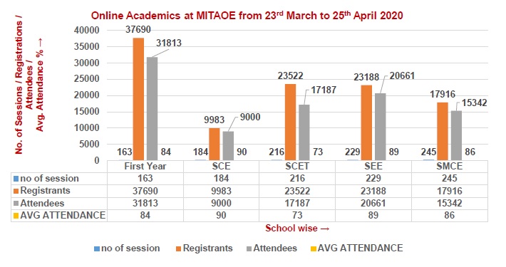 But like it is said, where there is a will, there is a way. We at MIT Academy of Engineering have decided to offer online classes for the students in these testing times to tackle this. We are recognized as one of the top engineering colleges in Pune , offering undergraduate and postgraduate courses in engineering.The institution was set up as a source of knowledge, and to skill, a student would need to lead a healthy career. A huge number of students have realized their potentials, their dreams, and have shown faith in our institution, and now we lead lives they wished for, built by themselves, with guidance from our great faculties. We feel it unjust for some students to be denied the right to gaining the education they desire. Hence, keeping in mind the national lockdown and the restrictions in gatherings, online classes are an excellent way to keep going the right way. It combines the efficiency of direct, face-to-face explanation by a good lecturer and the solution to the restrictions of movement within the country. Our institute is embedded with multiple advanced facilities, and thus is using them to provide education to students even in the tough times of pandemic. We have conducted approximately 40 live sessions with students from every year and course with a record attendance of 90%.We respect any and all guidelines laid down by the government for the safety of the people and will try to continue assisting the students while maintaining the rules and regulations. Online classes are a great way for the students to interact with the teachers/lecturers in times like these. Further, it adds to it the comfort and safety of learning from home, while cutting off the time students might otherwise have to consume for traveling from home to the colleges, probably that’s why over 11,000 new students registered for these classes.Our college has one of the best faculty and facilities, who have a lot of experience in the tasks they are assigned. They are equipped with the skills to effectively and efficiently transfer the knowledge they possess to the students, even in online classes. To attend online classes and learn from an expert is a much better way of learning than from researching on the internet, trying to grasp everything spread out in over ten different articles. Online articles can never hit a specificity that a good teacher can. This is why around 5000 students showed interest in these meaningful online classes.Have a look at graphical representation of 1 week (6th April to 12th April) to be more clear about registrations or attendees during this online sessions: